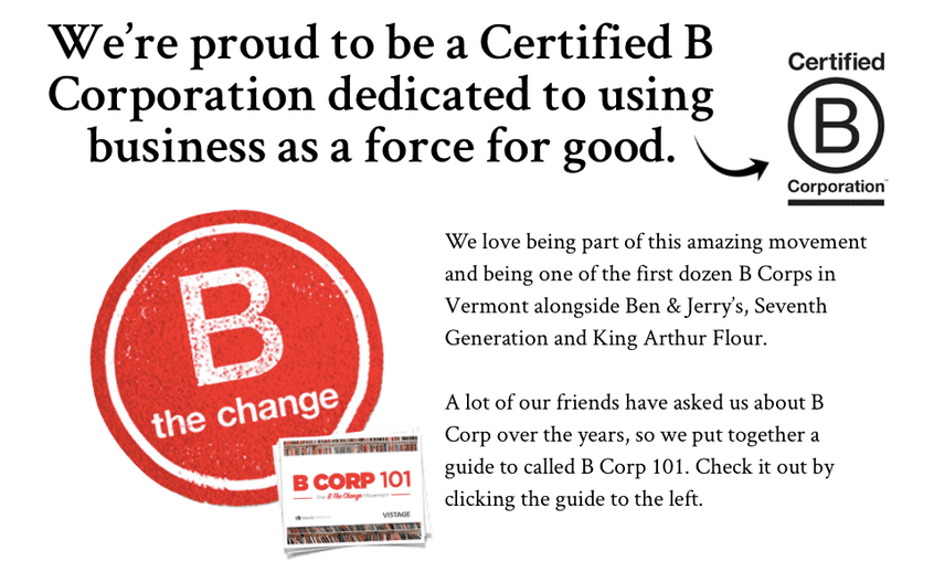 We were one of the founding B Corporations in New England, alongside some great companies like King Arthur Flour, Seventh Generation and Ben & Jerry’s. B Corps are dedicated to making our business a force for good by working with people who are making the world a better place, whether nonprofit, for profit or educational institutions.